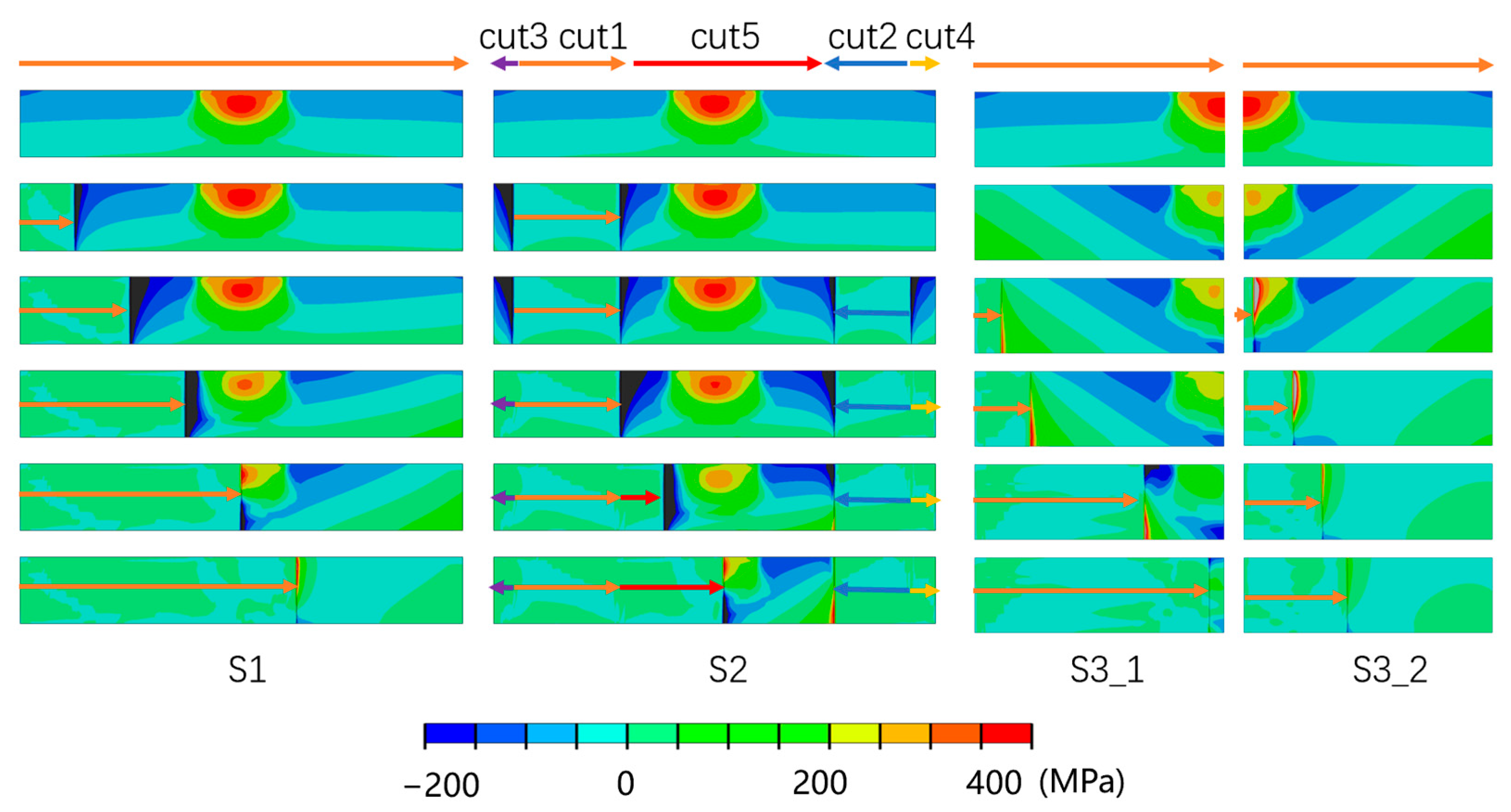 Figure 4 present maps of redistributed longitudinal residual stress introduced by simulated contour cuts (showing important features of the stress field at various cut lengths). The first column illustrates simulated contour cut results for the standard edge-crack cutting strategy (S1) at five cut lengths, the second column presents results from the embedded-cut strategy (S2), and the third and fourth columns show equivalent results arising from the proposed (new) orthogonal-cutting strategy (S3_1 and S3_2).