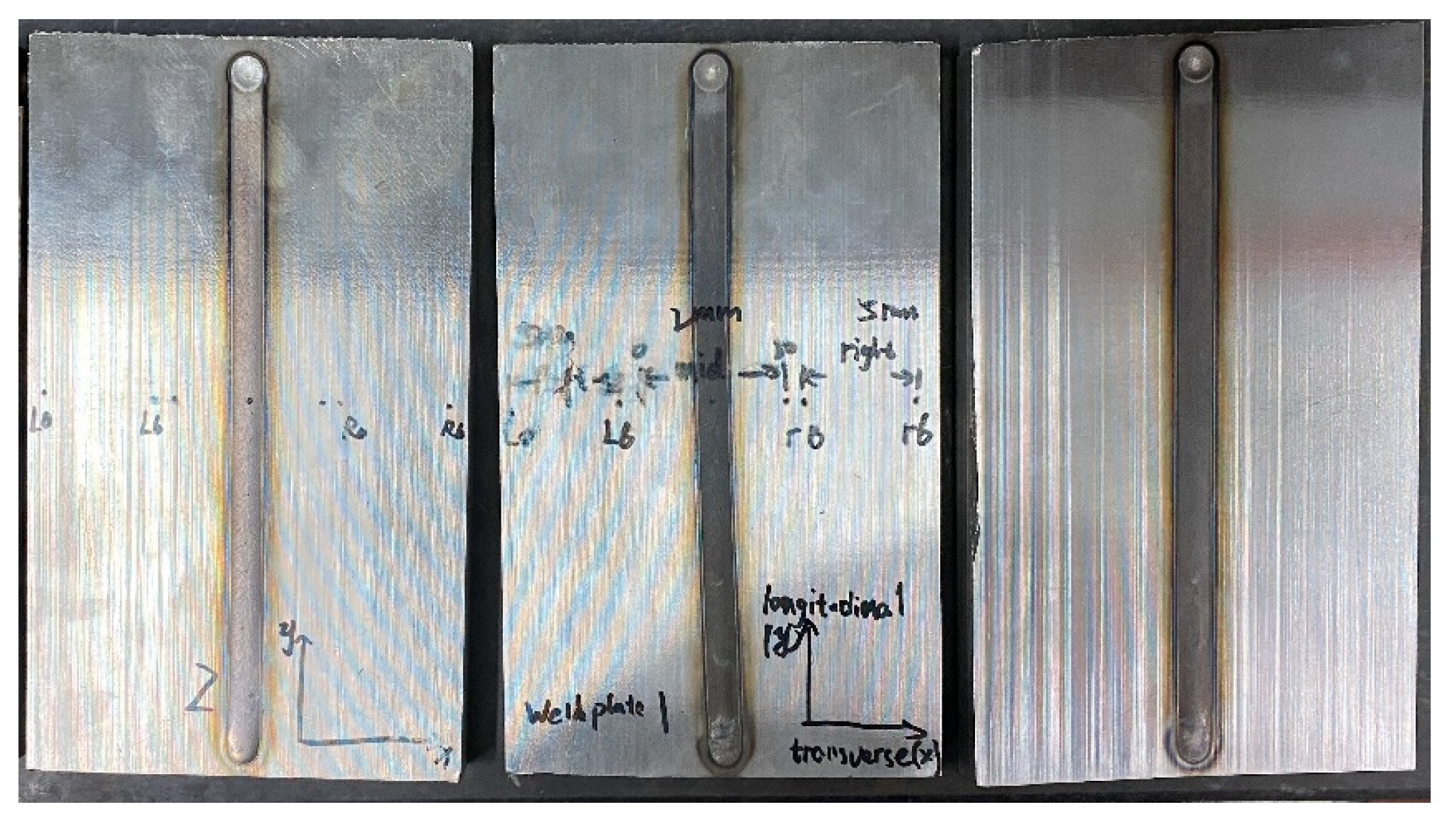 For this demonstration phase of work, three identical AISI Type 316H austenitic stainless-steel plates were machined to rectilinear dimensions of 200 mm × 120 mm × 18 mm. A gas tungsten arc welding process (GTAW) was then employed to introduce a single-pass autogenous weld along the longitudinal centreline of the top surface of each plate with an advance rate of 3 mm/s and welding current of 160 A under argon gas shielding. A self-fusion autogenous welding process without filler materials was used for welding of 316H steel plate, with the closed-circuit voltage in the range of 13–15 V. A photograph of the three welded plates is shown in
