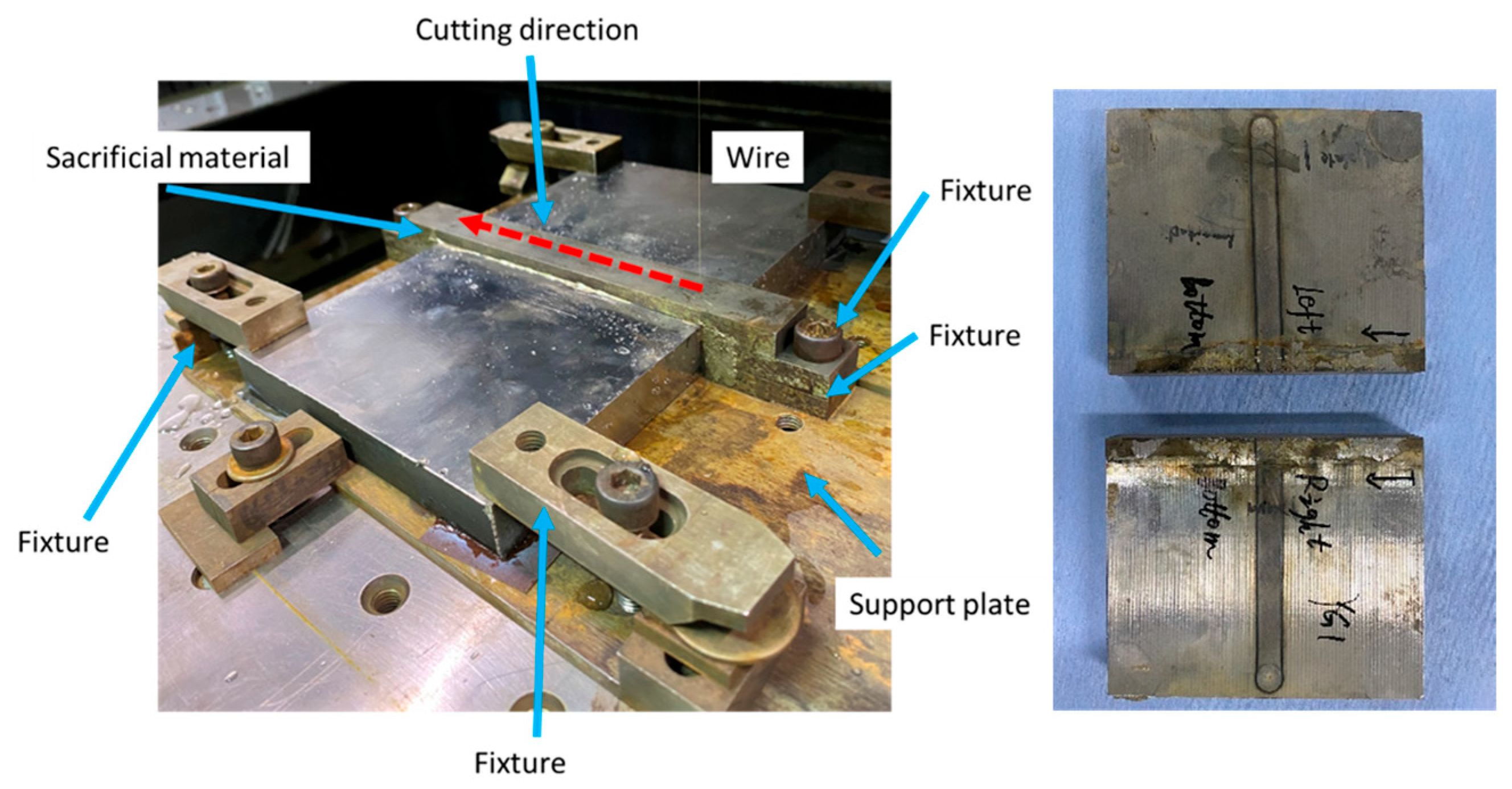 34], a bespoke contour cutting path can be designed that minimizes the development of stress concentration ahead of the wire EDM cut trajectory and thereby reduces the introduction of CIP stress errors. Another approach, referred to as the “embedded cutting configuration”, leverages the self-restraint of the test component during cutting in order to reduce the CIP strains, and this has also shown some success in practice [
