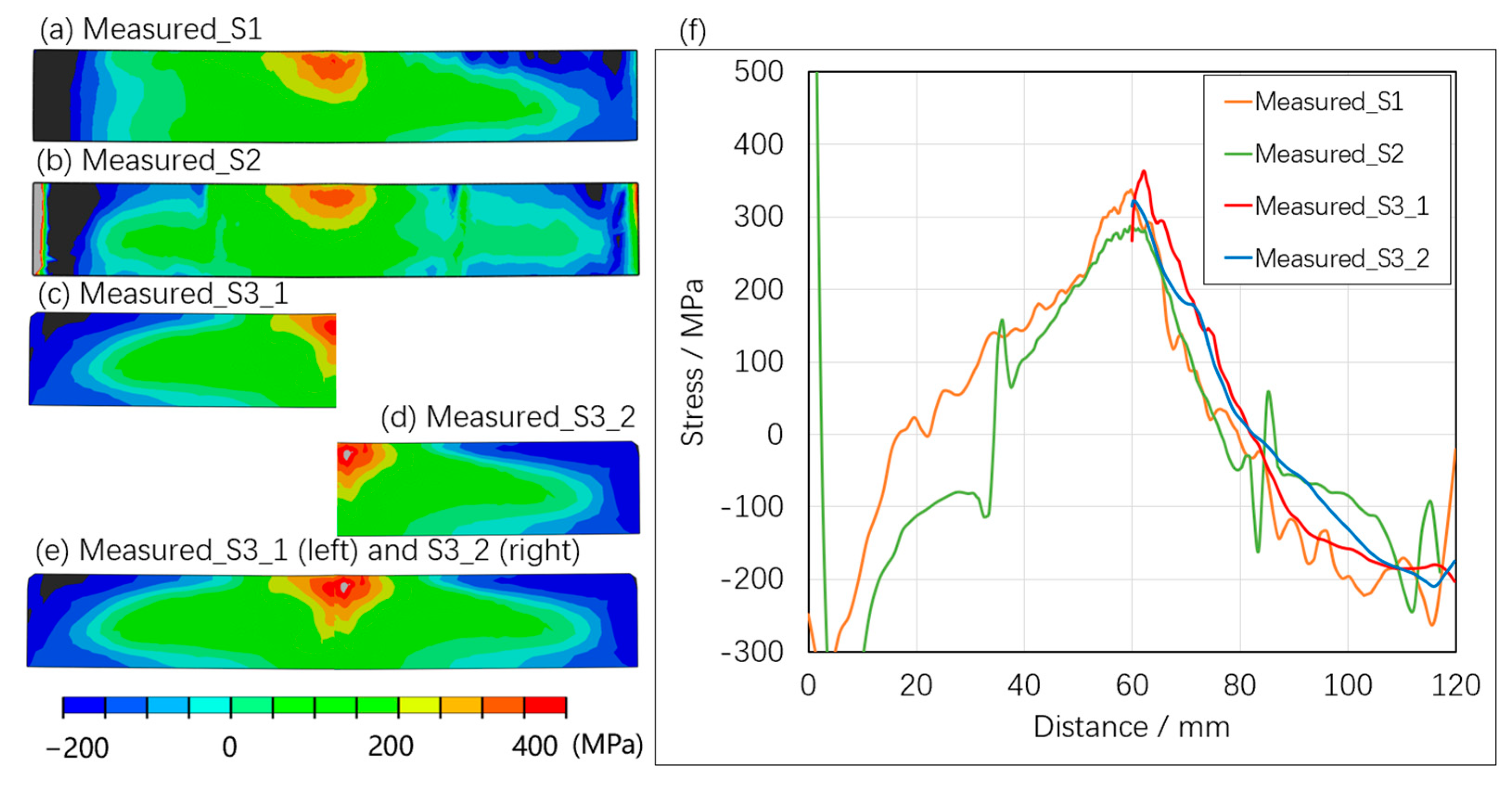 Figure 9f), and observe that the two measured profiles are almost mirror symmetric (if we ignore the erroneous S3_2 local peak). This close correlation implies that cutting sequence S3_1 has delivered a measured residual stress profile that is essentially free from CIP-related stress errors. Moreover, the contour simulations for the evaluation weldment have shown how ‘measured’ stress errors are related directly to the impact of CIP strains and therefore how errors can be mitigated by minimizing, or preferably eliminating, CIP deformation during contour cutting.