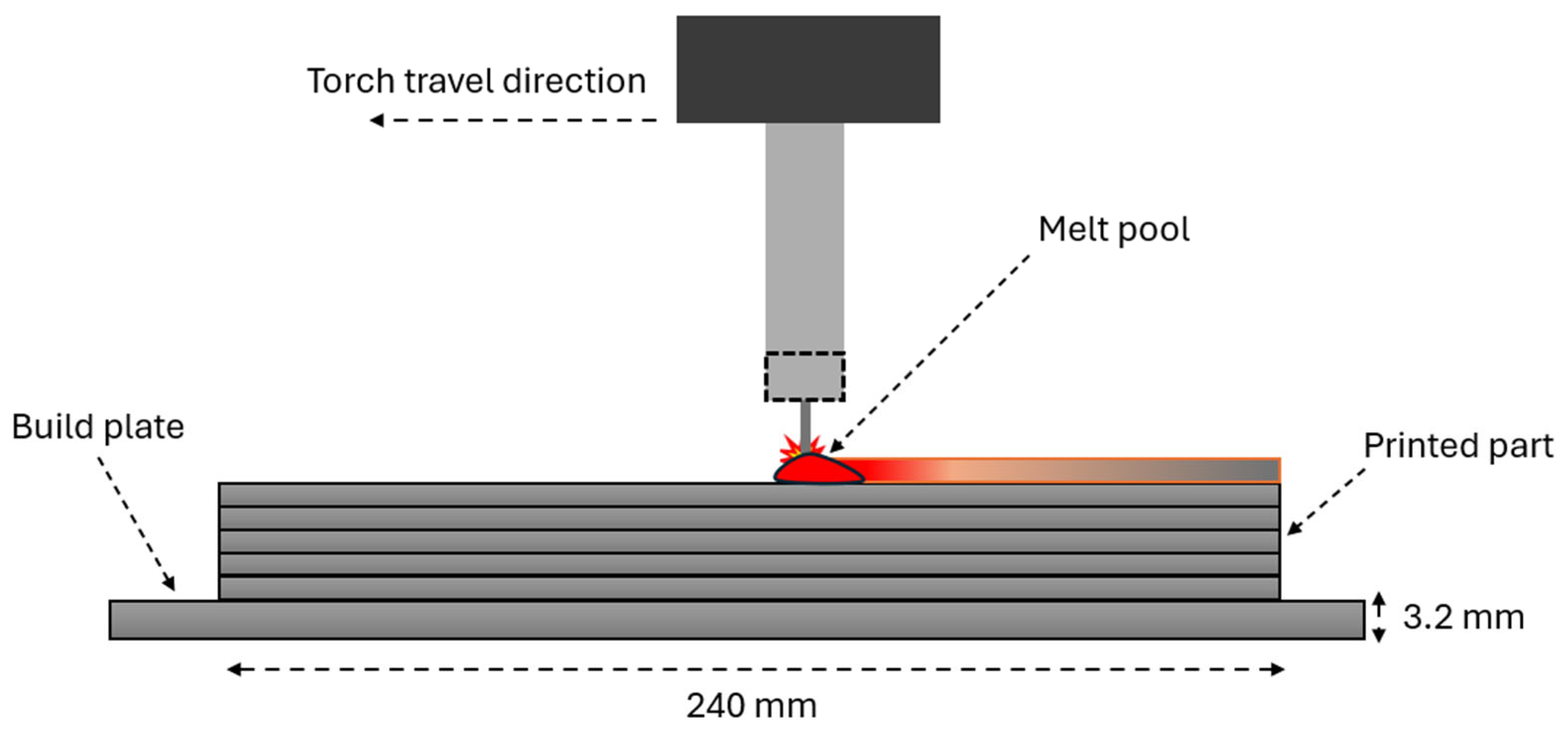 Simple multi-layer walls, 240 mm in height, were manufactured using stainless steel solid wire as the feedstock material, and 3.2 mm thick rectangular plates made of mild steel were used as substrates.