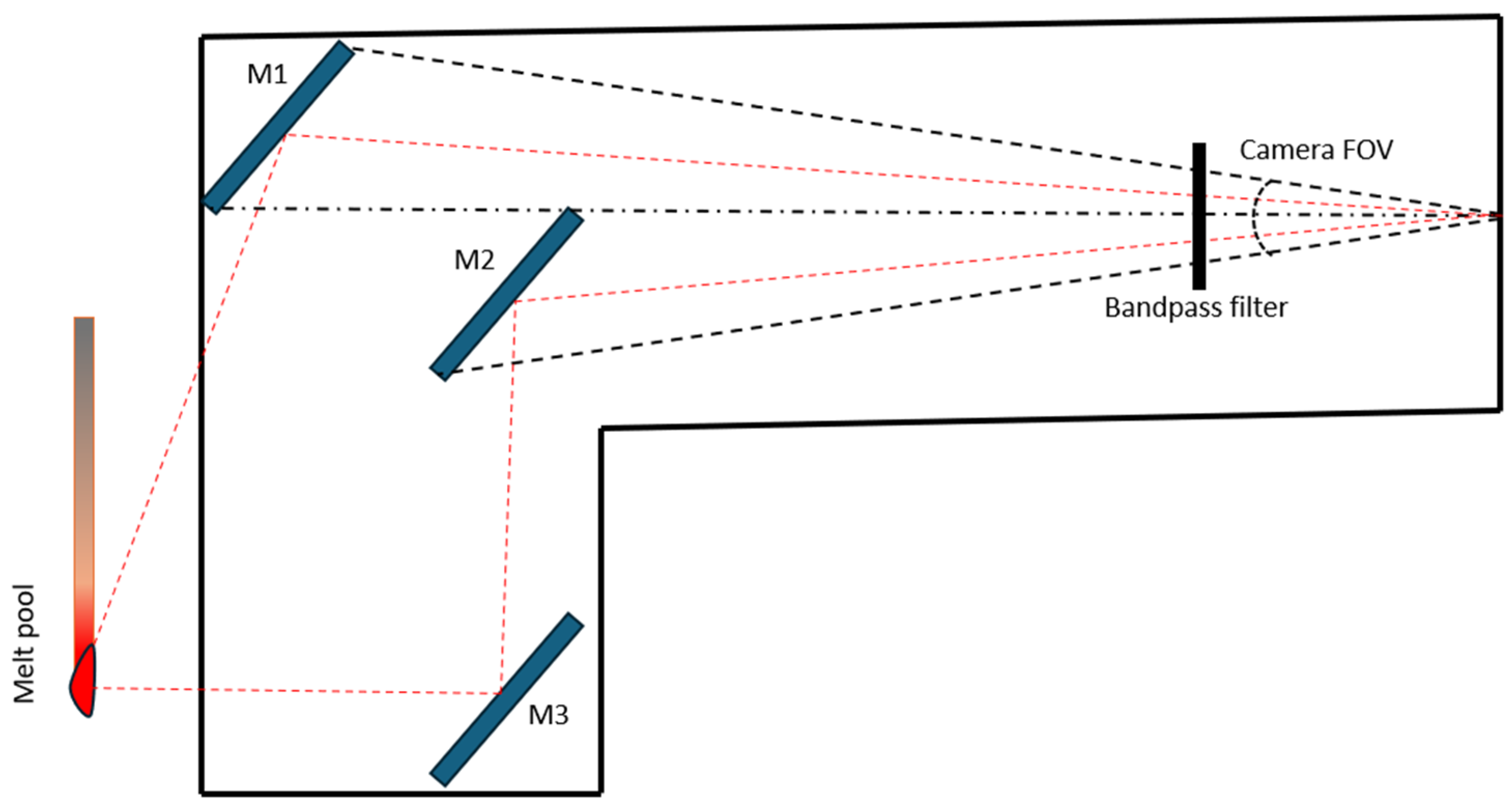 M2 and M3 are oriented at 45 degrees with respect to the horizontal axis. M1 is oriented at approximately 60 degrees to provide a better top view. A bandpass filter is placed in front of the camera to block excessive light and spatter emitted from the weld arc.