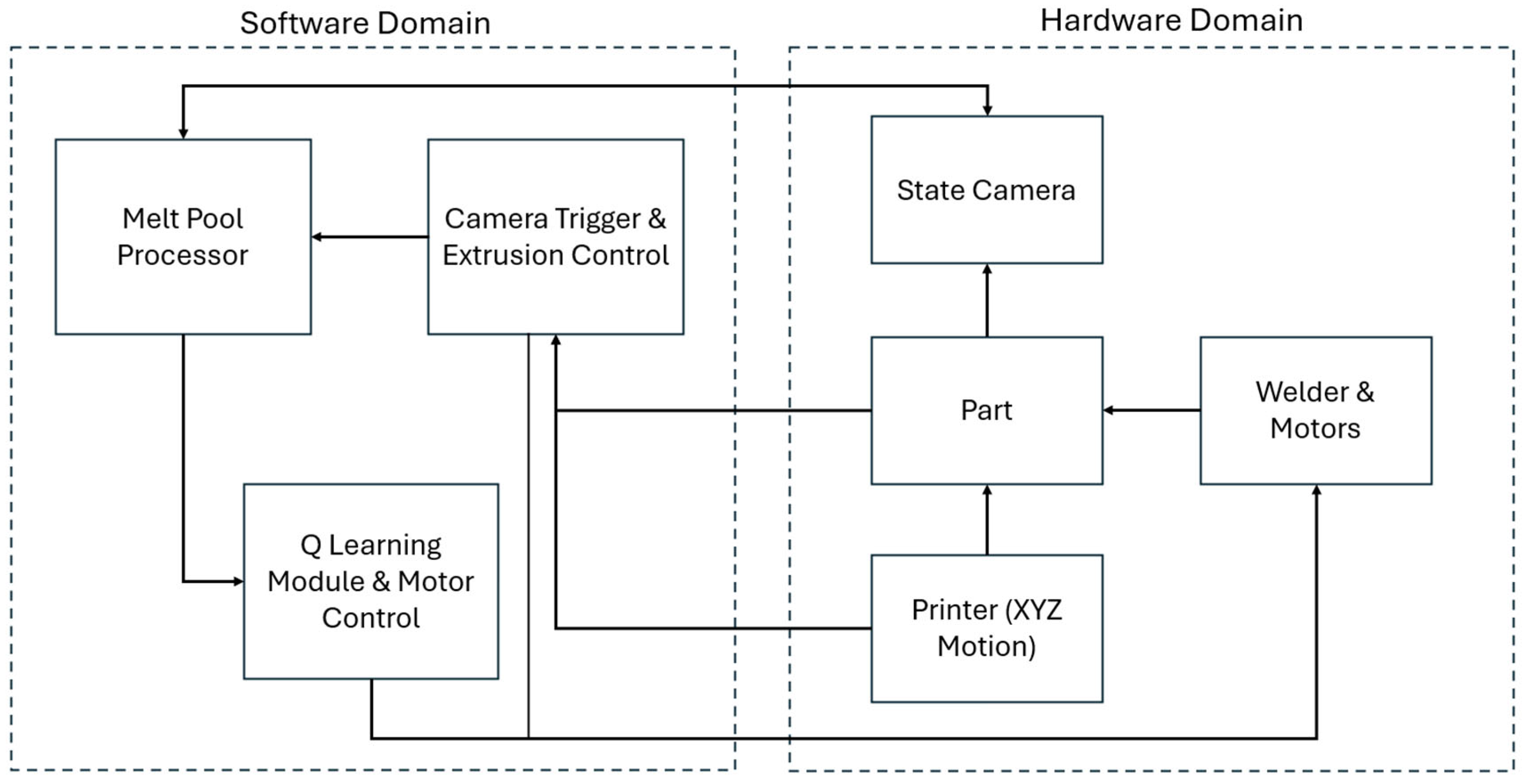 Voltage and wire feed rate were selected as control variables because they directly govern melt pool energy input and material deposition rate while being readily actuated via stepper motors interfaced with the welder’s mechanical adjustment dials. Torch travel speed and interlayer dwell time, which are controlled through the FDM printer’s G-code system via serial communication, were held constant. Including these parameters would expand the action space from 130 to over 1000 combinations, substantially increasing training data requirements and learning time. This constrained action space allows focused investigation of welder parameter control before integration with motion control in future work.