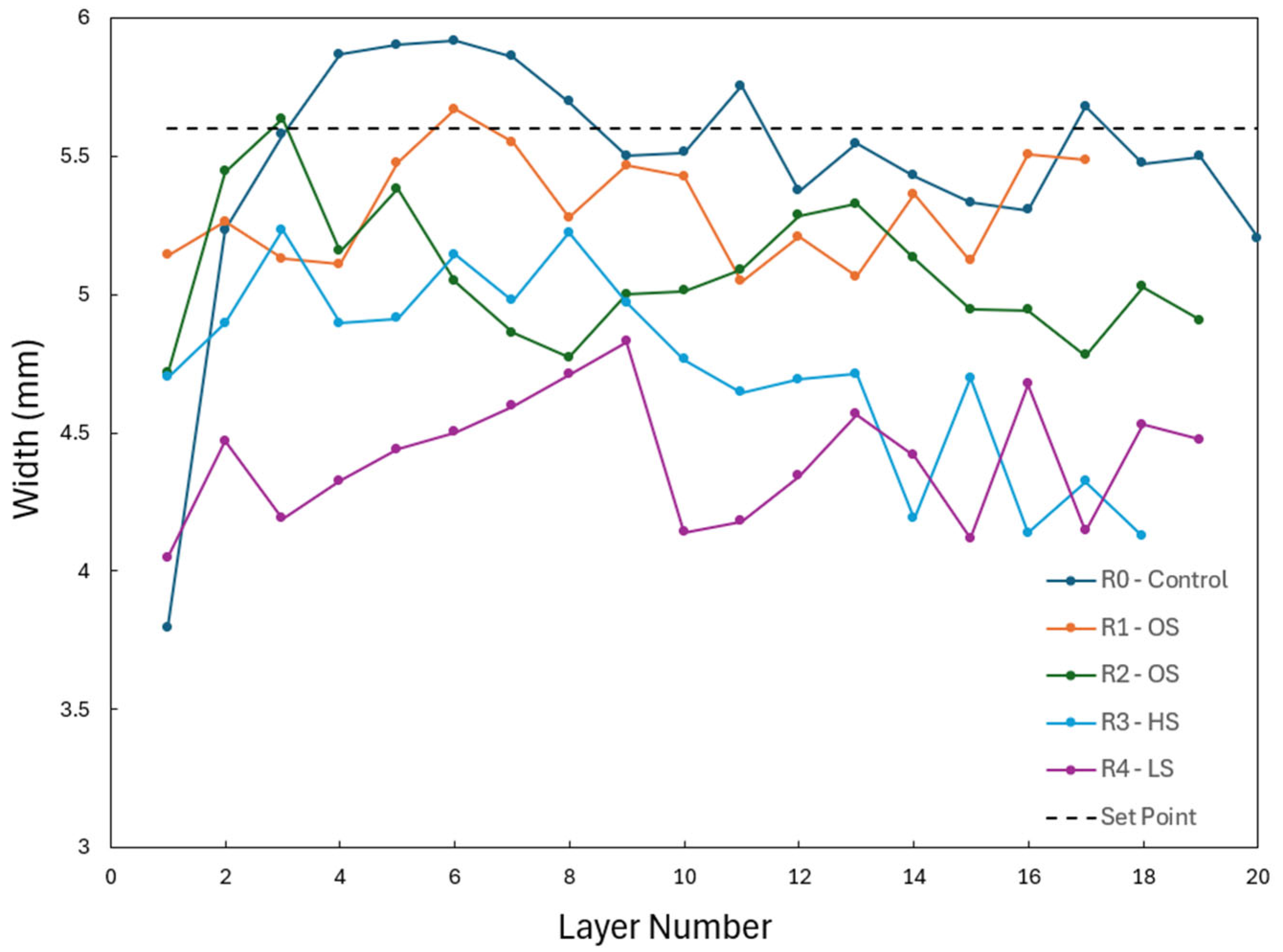 Target geometry was established from prior calibration data. A 20-layer control print was completed at the OS parameters, with six height and width measurements taken per layer. Averaging these values yielded setpoints of 1.54 mm for layer height and 5.6 mm for layer width. This control dataset serves as the baseline for comparison against the reinforcement learning runs. Importantly, the control print also illustrates the natural tendency of the system to drift without feedback, thereby providing context for evaluating the corrective effect of the Q-learning controller.