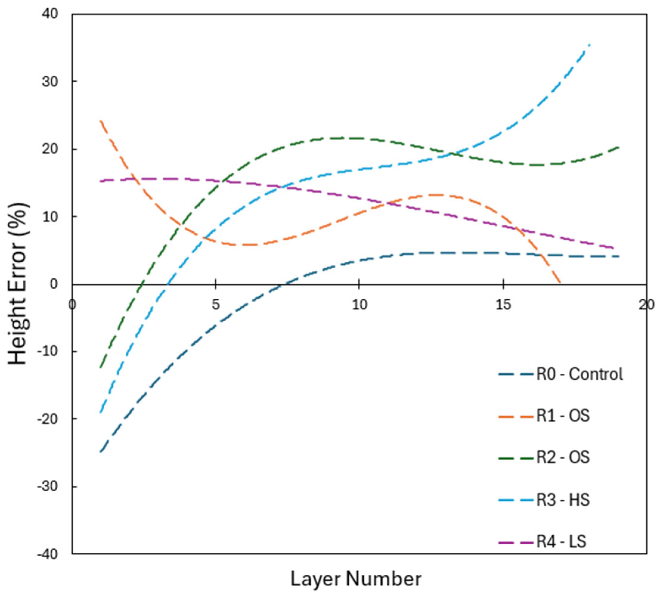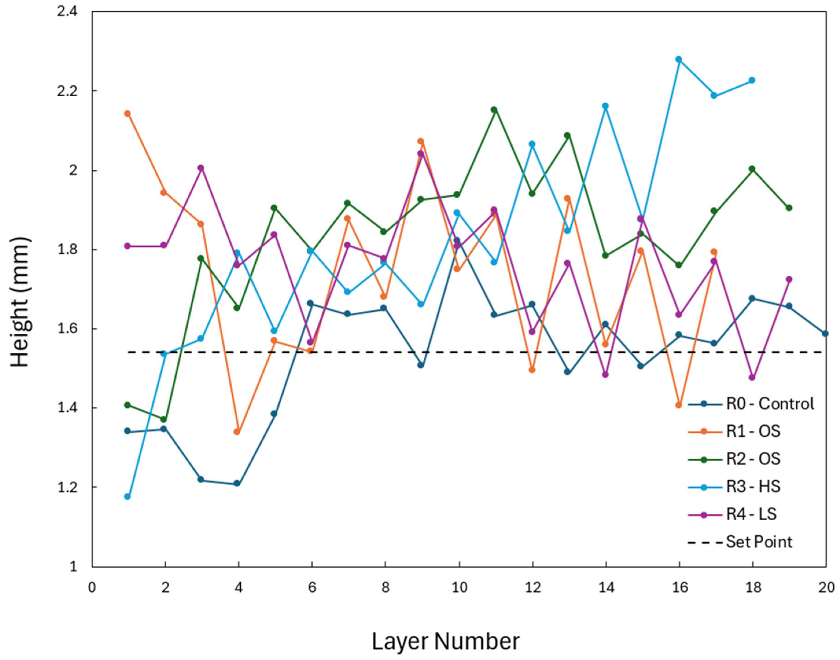 Figure 11 shows the trendlines observed from these measurements, demonstrating the sinusoidal nature of the response. This oscillation suggests the controller was consistently correcting errors to minimize height deviation, a characteristic similar to proportional feedback systems under noisy sensing conditions. While not perfectly converging, this pattern shows that the controller successfully prevented cumulative error, so that deviations remained bounded rather than increasing layer by layer. From a practical manufacturing standpoint, such stability is preferable to drift as it prevents compounding defects over long builds.