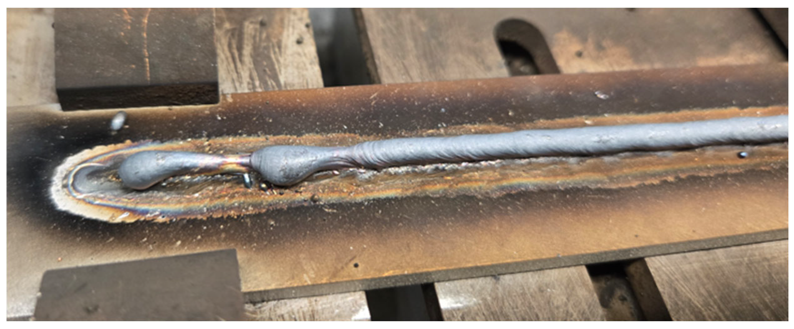 Figure 12 shows the LS run. The low starting voltage produced poor contact with the substrate, generating excessively tall initial layers. The controller responded with gradual voltage increases, increasing the melting and lowering the layer height, ultimately restoring stable deposition conditions and producing a well-formed pass.