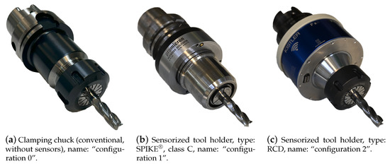 Three tool holders were examined in this study. Two of these were sensorized for the measurement of the process forces and torques occurring. Figure 1 provides an overview. In addition, the names used over the course of the paper, e.g., in Section 3, are indicated in the captions of the subfigures. The entire designation is structured as follows: first the designation of the tool holder (configuration 0 represents “Clamping chuck”, configuration 1 represents “Sensorized tool holder, type: SPIKE®”, configuration 2 represents “Sensorized tool holder, type: RCD (rotating cutting dynamometer)”), followed by the number of the tool used after the underscore (e.g., “_1” stands for tool 1, “_2” for tool 2, etc.).
