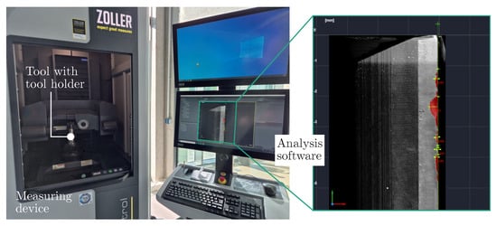 In this study, the measurement and evaluation of tool wear is performed using the edgeControl universal measuring machine from ZOLLER and its software pilot 4.0. After each of the different milling operations shown in Table 1, the tool is removed from the milling machine and measured on the measuring device. The tool remains in the tool holder for this process. Figure 4 shows a photograph of the measuring station and a detailed representation of the measurement results.