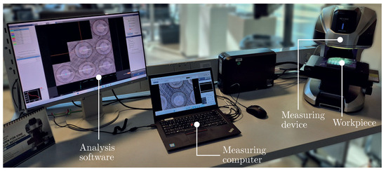 The 3D profilometer used in this work, type VR-5000/VR-5200, from the manufacturer Keyence, works according to the fringe light projection method. Due to the possibility of both non-contact and surface-based measurement, area-based characteristic values can be determined, which are expected to be more informative than line values [27]. Figure 5 shows the measurement setup for measuring the surface quality.
