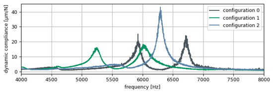 Figure 6 shows the result of the experimental modal analysis. The H1 transfer functions of the dynamic compliance of the three clamping configurations in the frequency range between 4000 Hz and 8000 Hz are shown. According to the analysis of the scans, the dominant natural bending frequencies of the configurations are located in this frequency range.