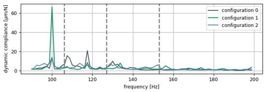 According to Table 1, three different spindle speeds are used in the tests, resulting in tooth passing frequencies of 106.00 Hz, 127.33 Hz, and 152.80 Hz. Figure 7 shows the dynamic compliance in the range between 90 Hz and 200 Hz, with the tooth passing frequencies shown as dashed vertical lines. It can be seen that the amplitudes of the different configurations differ at the relevant frequencies. Table 2 shows the amplitudes at the frequencies that occur in the process. The differences between configurations 1 and 2 in relation to configuration 0 are shown in brackets.