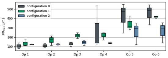 Maximum width of the flank wear land () per operation for each clamping configuration. The boxplots show data from three repeated tests.