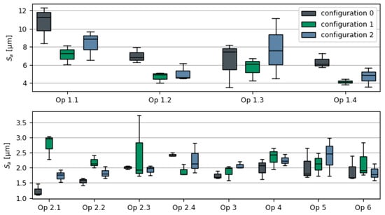 For operation 1, configuration 0 shows the highest median values and generally a greater scattering than the other two configurations. On average, configuration 1 produces the lowest surface roughness values for this operation. Overall, the surface roughnesses achieved in operation 1 are in a wide range, between approximately 4 µm and 12 µm, and are therefore significantly worse than with all other operations.