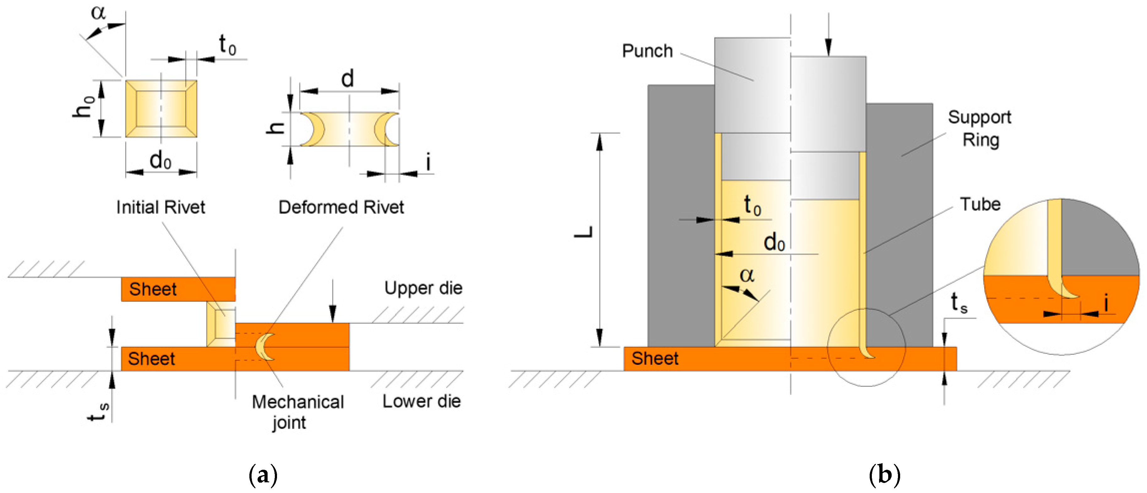 - Alves, L.M.; Afonso, R.M.; Martins, P.A.F. Self-pierce riveting of tubes to sheets. J. Adv. Manuf. Technol. 2020, 111, 3351–3360. [Google Scholar] [CrossRef]