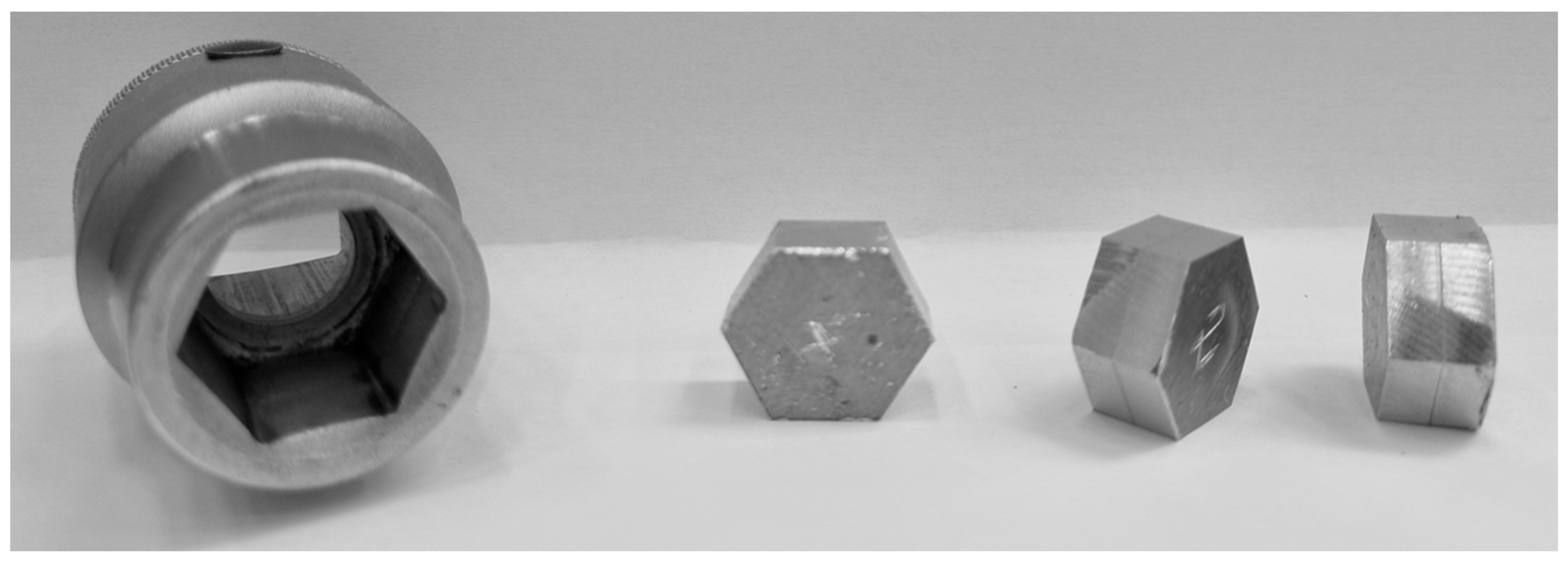 - Torsion tests followed ISO 18338:2015 [25] and were carried out on a GUNT WP510 torsion testing machine (Figure 3b) at a rotation speed of 50°/min. This machine features a stationary and a moving head, enabling the application of torsional loads to the specimen. Due to the shape of the torsion heads, specimens were machined into a hexagonal profile, as illustrated in Figure 4.