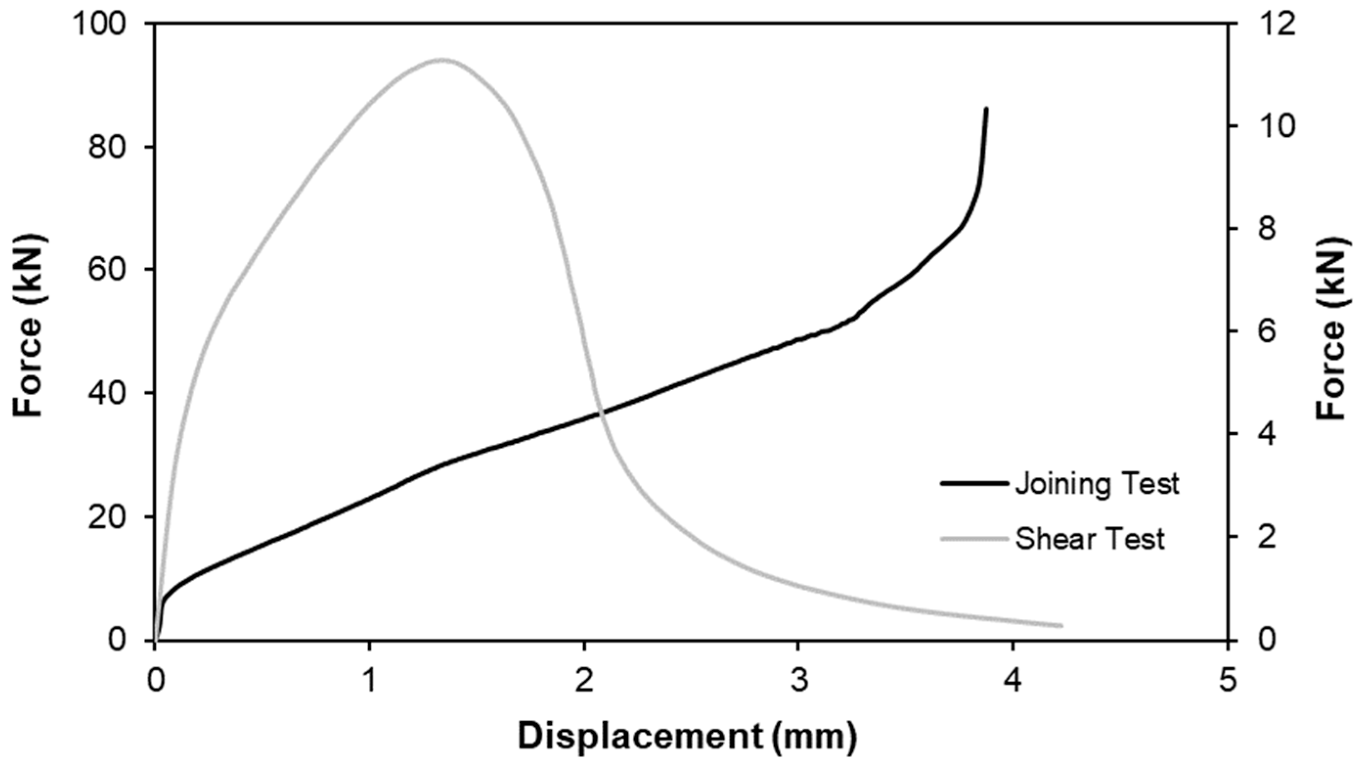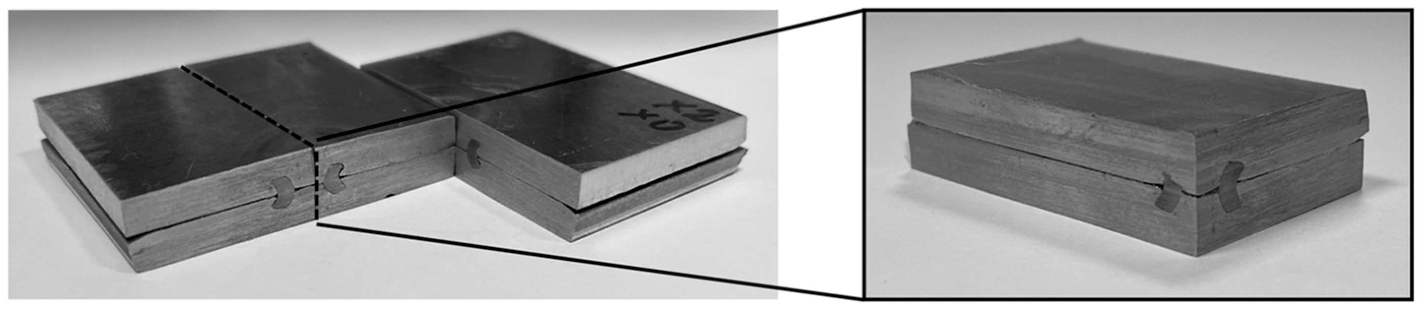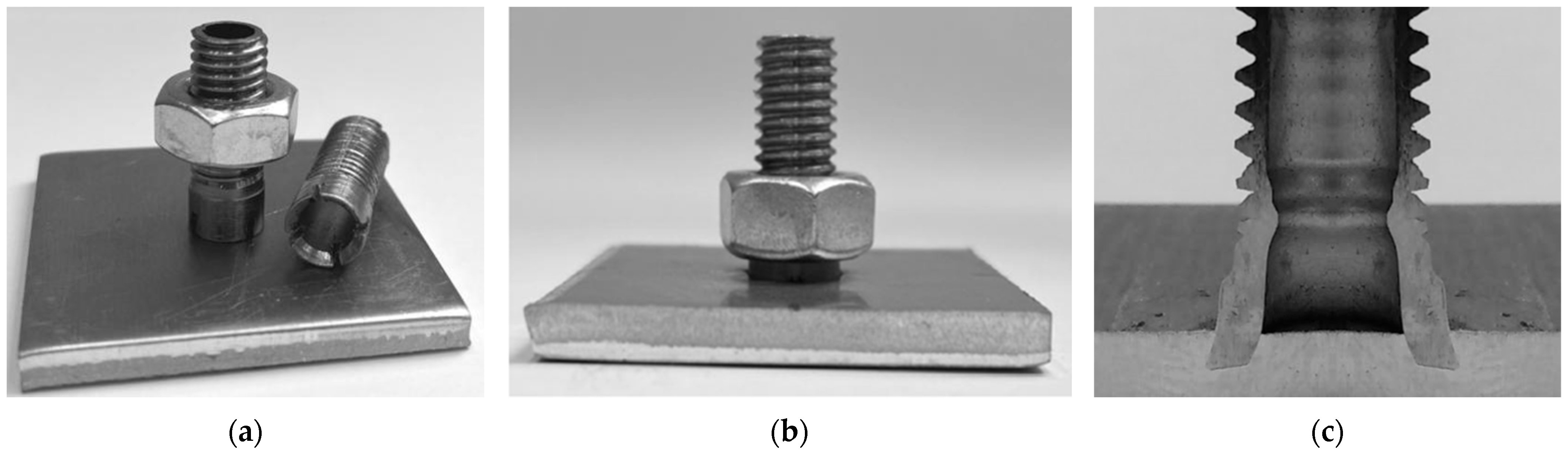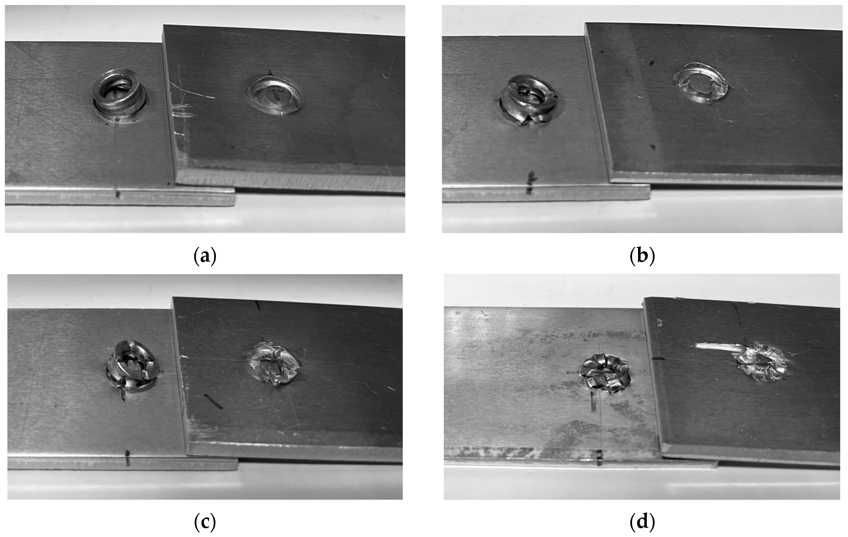 - ISO 12996:2013; Mechanical Joining—Destructive Testing of Joints—Specimen Dimensions and Test Procedure for Tensile Shear Testing of Single Joints. ISO—International Organization for Standardization: Geneva, Switzerland, 2013.
