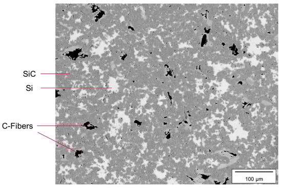 SEM image of the Cesic® microstructure of a polished sample. C-fibers are represented by the darker areas, whereas the gray regions are SiC with Si (white spots).