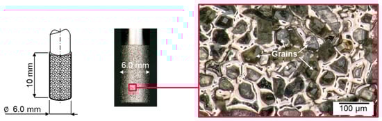 The diamond grinding tool from Heson Diamantfeilen GmbH (75210 Keltern-Dietlingen, Germany) used for the machining experiments is illustrated in Figure 2. It corresponds to a diamond grinding pin with a diameter of 6.0 mm and a diamond grain size D46 (acc. to the FEPA standard) with an average grain diameter of 45 µm, and galvanic bonding. In order to ensure comparability in the experiments, a new tool was used for each machining condition.