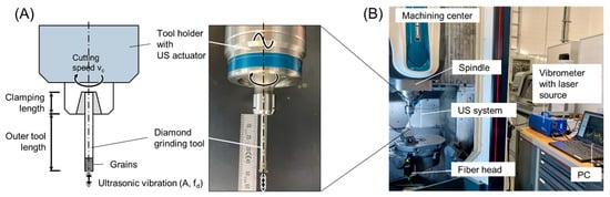 In order to determine the effect of the ultrasonic (US) oscillation on the overall process, the behavior of the ultrasonic amplitude was first characterized without actual machining of the ceramic workpiece. Figure 3 shows the experimental setup of the US-amplitude measurement. The diamond grinding tool was fixed by a collet chuck to the tool holder over the clamping length, whereas the US vibration-assisted tool holder is clamped into the spindle of the five-axis machining center. The US actuator is integrated into the tool holder. The optimum working frequency (or natural frequency) of the actuator depends on both the mass and the geometry of the entire vibrating system (including the actuator, clamping interface, and cutting tool). The US amplitude was measured by a laser vibrometer (Laser Doppler Vibrometer Typ Fiber, Optomet GmbH, 64297 Darmstadt, Germany) on the tool tip with a sample rate of 1.6 MHz without spindle rotation. The mean value and the standard deviation of the amplitude were calculated from 1000 individual measurements.