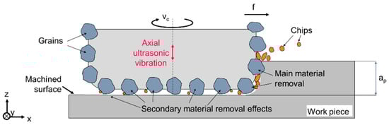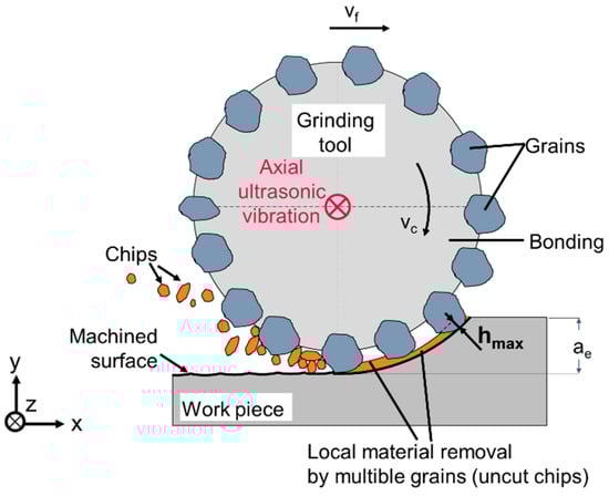 Figure 4 shows a schematic model of the material removal during the applied down-grinding process. Due to the irregular shape and position of the abrasive grains, as well as the multiple engagements with the workpiece material, the mean uncut chip thickness hmax in grinding processes can only be determined by statistical approaches. The US vibration in the experiments acted perpendicular to the cutting direction and along the tool axis (z-axis).