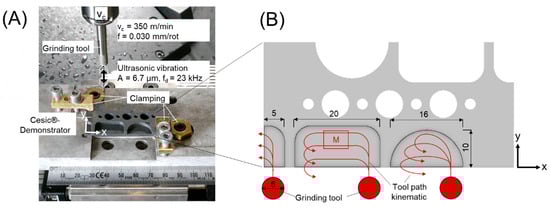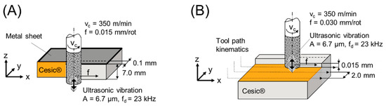 Figure 5 shows the schematic of the setups for the amplitude detection and the load measurement grinding experiments. In order to measure the default US amplitude contour, UAG was performed on a stack consisting of a 0.1 mm thick metal sheet and a 7.0 mm thick Cesic® specimen, which was fixed by gluing (Figure 5A). The side surface of the stack was machined by the abrasive grains located along the circumference of the grinding tool (so-called contour grinding). The tool axis and the ultrasonic vibration were parallel to the machined surface.