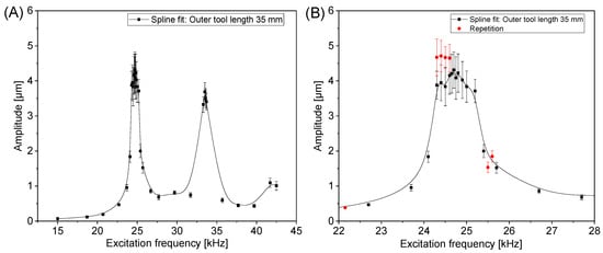 The most effective ultrasonic (US) vibration with maximum amplitude is achieved when the vibrating system—comprising the US actuator, clamping device, and grinding tool—operates at its natural frequencies. Figure 7A shows the relationship between the US amplitude of the grinding tool tip and the frequency within a frequency range between 15 kHz and 42.5 kHz. In this range the US system has three natural frequencies with local amplitude maxima, with 4.3 µm at 24.8 kHz being the largest value. The outer tool length was set to 35 mm. Its repeatability is demonstrated in Figure 7B for some frequencies close to the peak at 24.8 kHz. When clamping the tool out/in again in the tool holder and repeating the experiment to verify the accuracy of the measurement method, the natural frequency changed by about 0.4 kHz, from 24.8 kHz to 24.4 kHz. This demonstrates the sensitive behavior of such a vibration system and highlights the importance of individually tuning each tool before processing, since even a small frequency change of 0.5 kHz may lead to an amplitude decrease of approximately 10%. A variation of 1.0 kHz resulted in even higher amplitude reductions of up to 70%.
