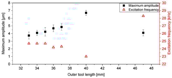 The influence of the geometry on the maximum amplitude and its corresponding US excitation frequency were analyzed for different outer-tool lengths, as shown in Figure 8. An increase in outer-tool length from 33 mm to 40 mm led to an almost linear increase in the maximum amplitude from 3.7 µm to 6.7 µm and a decrease in the natural frequency from 24.8 kHz to 23.0 kHz. The increase in the tool length elongated the overall length of the vibrating system at constant mass, which resulted in a higher amplitude at the tool tip.