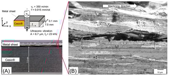 In order to verify the default US vibration in the UAG process, a metal sheet was glued onto a Cesic® specimen (Figure 10A). Since the metal sheet was very thin (0.1 mm) compared to the ceramic material (7.0 mm), it had negligible influence on the process conditions during contour UAG.