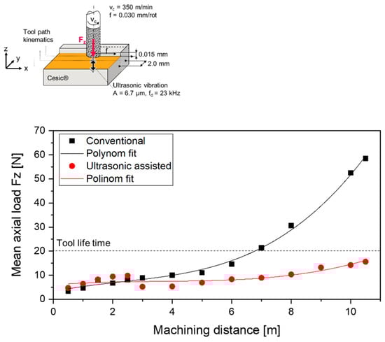 The mean axial load Fz for surface grinding is plotted in Figure 11 at a machining distance of 10.5 m for the two grinding strategies. During the first three meters, both CG and UAG showed almost constant behavior, with Fz below 10 N. Beyond this machining distance, CG exhibited a sudden increase in load, which can be approximated by a polynomial fit. The tool lifetime for CG, however, was already reached at a machining distance of approximately 6 m, corresponding to a Fz of 15 N. Further machining after this point resulted in a loss of dimensional stability of both the tool and the workpiece.