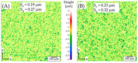 Surface roughness of the machined component was assessed by the focus variation method with an optical micro-coordinate measuring system (Alicona Infinite Focus, Bruker Austria GmbH, 80774 Raaba, Austria). The area roughness parameters Sa (arithmetic mean height) and Sq (root mean square height) were extracted according to standard DIN EN ISO 25178 [28] and evaluated using the software of the optical micro-coordinate measuring system by applying a robust Gaussian filter with a cut-off length of 0.2 mm. The measurement area was 1 × 1 mm2 at a vertical resolution of 50 nm and a lateral resolution of 0.88 μm.