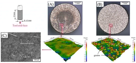 Microscopic image of the grinding tool’s end face with the 3D-topography after pocket machining for (A) conventional and (B) ultrasonic-assisted grinding, and (C) SEM image of the tool’s end face after conventional grinding.