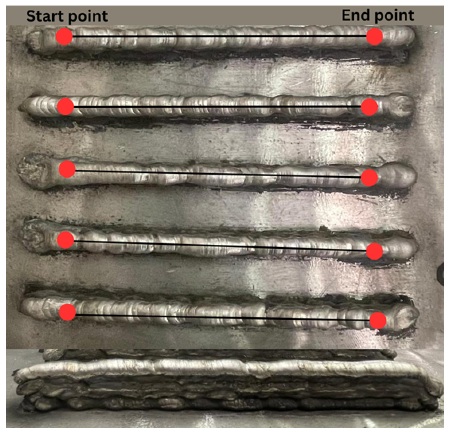 16]. Wire feed speed was varied between 175 and 200 in/min to capture the transition between underfill and excessive deposition regimes. Travel speed was selected within 3–5 mm/s to represent practical ranges where changes in heat input per unit length influence bead geometry without causing lack of fusion. Voltage was investigated in the range of 14–17.5 V, to have stable arc operation while avoiding excessive spatter or shallow penetration. These ranges provided a reliable basis for systematic analysis of surface waviness.