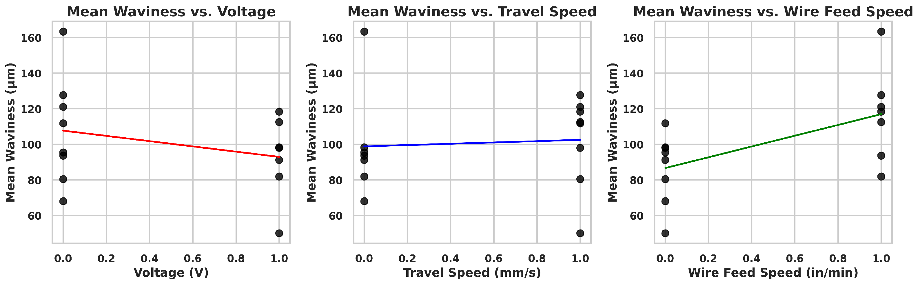 Figure 3. In the case of voltage, the regression line exhibits a slight negative slope, indicating that increasing voltage tends to reduce waviness. This behavior is consistent with previous reports that higher arc voltage stabilizes and elongates the arc, leading to more uniform heat distribution and smoother material deposition [