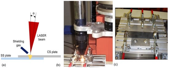(a) Sketch of the autogenous laser welding process; (b) general view of the welding area; (c) detail showing the welding jig fixture of the CS–SS plates.