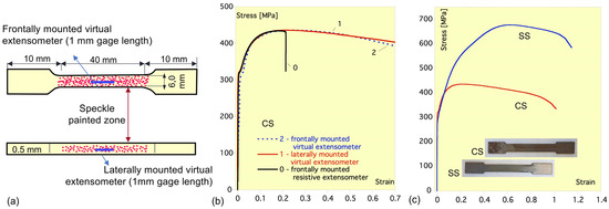 Figure 2b shows the agreement of the strain–stress curves resulting from the measurements made on the CS specimen taken with the three extensometers. The only notable differences were due to the location of the resistive extensometer, which stopped detecting strain changes beyond maximum load because necking developed outside its strain gauge [32]. Figure 2c contains the stress–strain curves of CS and SS tensile-flat specimens obtained from the laterally mounted virtual extensometers, together with their corresponding images.