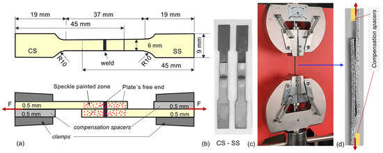 These pure tensile tests, as well as the further combined tensile-shear tests performed to characterize the mechanical performance of the CS–SS dissimilar overlap joints, were performed with an Instron 8501 servo-hydraulic testing machine (Instron, 825 University Ave., Norwood, MA, USA), equipped with a static load cell of 5 kN. The two types of tests were carried out at a constant crosshead speed of 0.05 mm/min. The geometric configuration of the three specimens used for tensile-shear testing (Figure 3a) resulted from cutting the laser-welded CS-SS plates with an electrical discharge machine (EDM). Figure 3b shows two of these specimens. The test setup, also shown in Figure 3a, requires two compensation spacers, with each of them being mounted at the clamping ends of the specimen, to ensure that the load consists of two equal, opposite, and collinear forces lying on the loading axis of the testing gripping device. The presence of the spacers made the loading axis coincide with the longitudinal axis of symmetry shared by the faces of both plates in mutual contact. The coincidence holds throughout the loading process for the respective loaded sides of the welded plates, since the unloaded ones, from the weld to their free ends, progressively rotate as rigid bodies. Lastly, a sufficiently large area of one of the lateral faces of the specimen was fine speckle-painted. This area, with the joint included, allowed the VIC-2D virtual extensometers to operate in the image sequence captured during testing. A general view of the tensile-shear test initiation is illustrated in Figure 3c, whereas Figure 3d shows a detail capturing of the CS-SS joint at the beginning of the test.