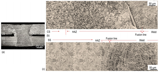 Optical microscope micrographs showing typical features of the laser welded CS–SS overlap joint microstructure: (a) macroscopic image of the joint with the positions of gradual microstructural changes in the joint (b) upper side, and (c) lower side.