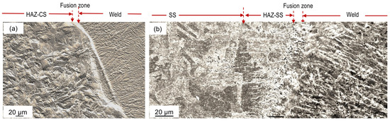 SEM micrographs detailing the HAZ, fusion line, and the welded joint on: (a) CS-side; (b) SS-side.