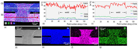 EDX maps and line analysis of Cr, Ni, and Fe in the laser-welded CS-SS overlap joint: (a) EDX overall elemental mapping; (b) EDX analysis along Line 1; (c) EDX analysis along Line 2; (d) SEM image of the joint; and elemental mapping of: (e) Fe; (f) Cr; and (g) Ni.