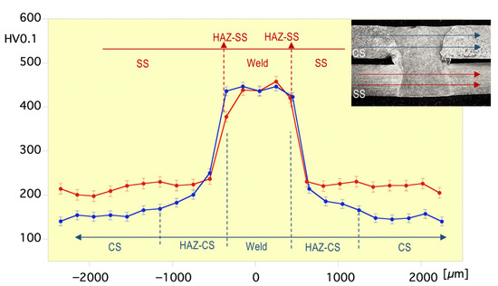 Figure 7 shows the results of the microhardness measurements performed along four indentation lines evenly spaced across the joint thickness, two of them in the CS upper side and the other two in the SS lower side of the joint, as depicted on the weld macrostructure. To ensure highly accurate measurement along each line, the distance between the applied indentations was set to 200 µm. Two distinct hardness profiles were obtained, one for the CS side and another for the SS side of the welded joint, plotted in the graph given in Figure 7, in blue and red, respectively. Each value of these profiles resulted from averaging two hardness measurements made on the CS and SS lines at positions equidistant from the weld center. The average hardness of CS (150 ± 7 HV0.1) was 25% lower than that of SS (200 ± 10 HV0.1) and the measurements performed in the weld zone showed an average value of 435 ± 10 HV0.1, which is three and two times higher than the values found in CS and SS, respectively. Then, because the width of SS-HAZ was less than 100 µm, its average hardness was estimated to be close to that of the weld bead. In contrast, the measured average hardness of CS-HAZ was 180 ± 7 HV0.1. Hence, the welded joint regions have not only distinct metallurgical properties but also distinct mechanical characteristics.