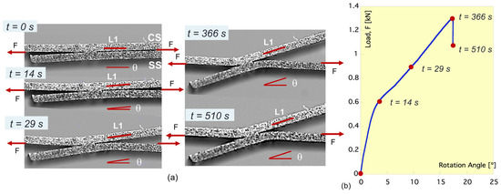 Rotation of the free ends of the CS-SS joint: (a) images captured during the tensile-shear test of the CS-SS specimen; (b) load vs. rotation angle plot (the red dots indicate the times corresponding to the image sequence captured during testing).