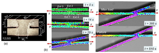 (a) CS-SS joint geometry (tCS and tSS are the respective thickness of the CS and SS plates, SW is the width of specimen, WL is the weld length, and W0 is the weld ligament joining the two plates); (b) VIC-2D strain maps for distinct instants of the tensile-shear test and the location of the four virtual extensometers (Ext. 1–Ext. 4).