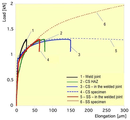 Tensile load–elongation curves of distinct areas from the laser-welded joint of CS-SS thin plates (1–4) and of the CS (5) and SS plates (6) for a 1 mm strain gauge.