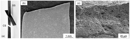 (a) Fracture in tension of the CS-SS-overlap-welded specimen; (b) macroscopic image of the broken CS plate; (c) micro-fractographic detail showing the ductile CS fracture.