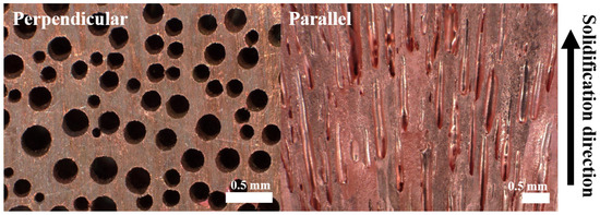 Optical micrograph of the cross-section showing unidirectionally aligned pores in lotus-type porous copper.