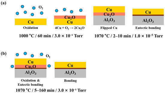 Before bonding, the copper surfaces were mechanically polished with 600-grit sandpaper and then pickled in a nitric-acid/ethanol solution mixed at a 1:3 volume ratio for 5 min at room temperature (RT). The specimens were subsequently ultrasonically cleaned in ethanol (99.9%) for 10 min. The DBC specimens were fabricated by bonding the alumina substrates with either lotus copper or copper sheet, as illustrated in Figure 2.
