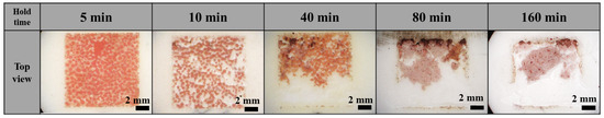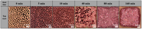 Previous studies have reported that bonding between copper and alumina can be completed within as little as 2–3 min [17]. Accordingly, bonding durations in this study were varied from 5 to 160 min. At 5 and 10 min, molten copper progressively filled the pores. With extended holding times, pore closure increased markedly, and the morphology underwent severe deformation, ultimately deviating substantially from the original structure. For the longest durations, pores disappeared entirely, and copper agglomerated into a single bulk mass. Residual unliquefied regions appeared as sharp, irregular protrusions.