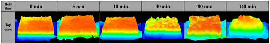 Figure 6 shows the surface height profiles of the bonded specimens. Prior to processing and at 5 and 10 min, the surfaces exhibited minor irregularities but remained relatively uniform in height. After 40 min or longer, extended oxidation and liquefaction caused the collapse of copper ligaments between pores, resulting in pronounced variations in surface height. Simultaneously, molten copper infiltrated and sealed the pores during cooling. With further holding time, all pores were eliminated, and the structure coalesced into a droplet-like morphology, with the central region remaining elevated due to surface tension of the liquid copper.