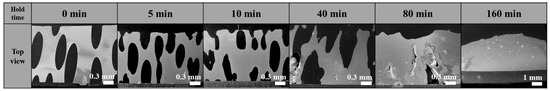 Figure 5 presents the morphological evolution of lotus-type porous copper maintained at the eutectic temperature for durations ranging from 5 to 160 min under a pressure of 0.4 Torr. The image at 0 min corresponds to the copper prior to the DBC process. During DBC bonding, solid copper on the surface is oxidized and liquefied at the eutectic temperature, enabling reaction and bonding with the alumina substrate [16]. Consequently, surface liquefaction of copper is essential. Once liquefaction begins, the molten copper becomes highly mobile. Unlike sheet-type copper, lotus-type porous copper lacks sufficient structural constraint to retain its original shape. As a result, the interconnected ligaments between pores are easily destabilized, rendering the porous structure extremely susceptible to morphological deformation during liquefaction.