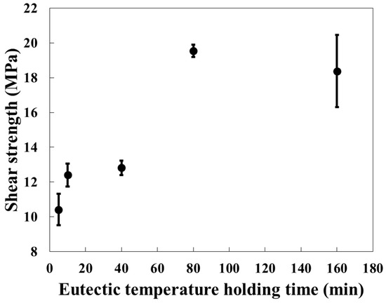 Figure 8 shows the shear strength of the bonded specimens. The specimen bonded for 10 min exhibited the highest shear strength of 12.4 MPa, representing an optimal condition where the morphology was preserved while achieving sufficient bonding. In contrast, the 5 min specimen retained the original pore structure but exhibited a lower shear strength of 10.4 MPa, indicating insufficient bonding. Specimens bonded for 40 min or longer generally showed higher strength; however, the morphology was severely deformed. Some specimens processed for 160 min exhibited low shear strength, resulting in large standard deviations that indicate inconsistent bonding quality. Moreover, severe surface irregularities rendered these specimens unsuitable for power semiconductor applications requiring dimensional precision.